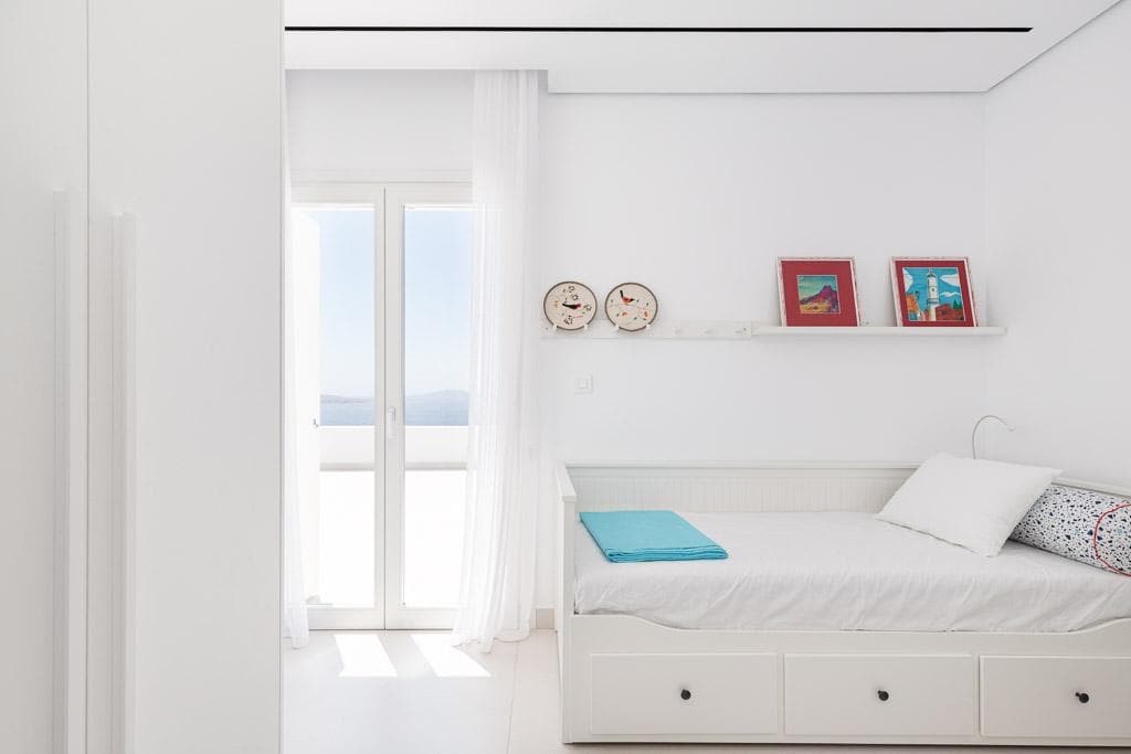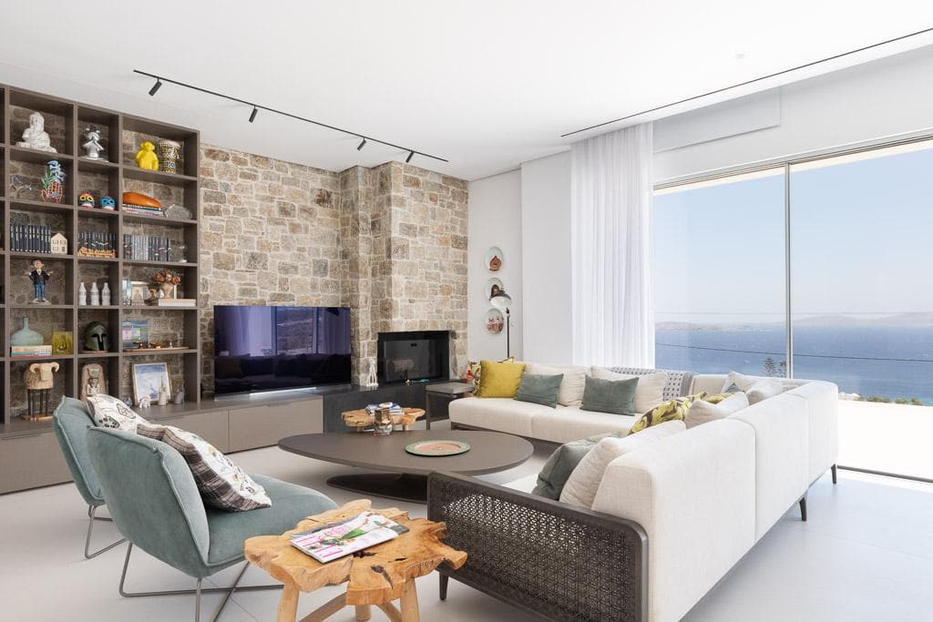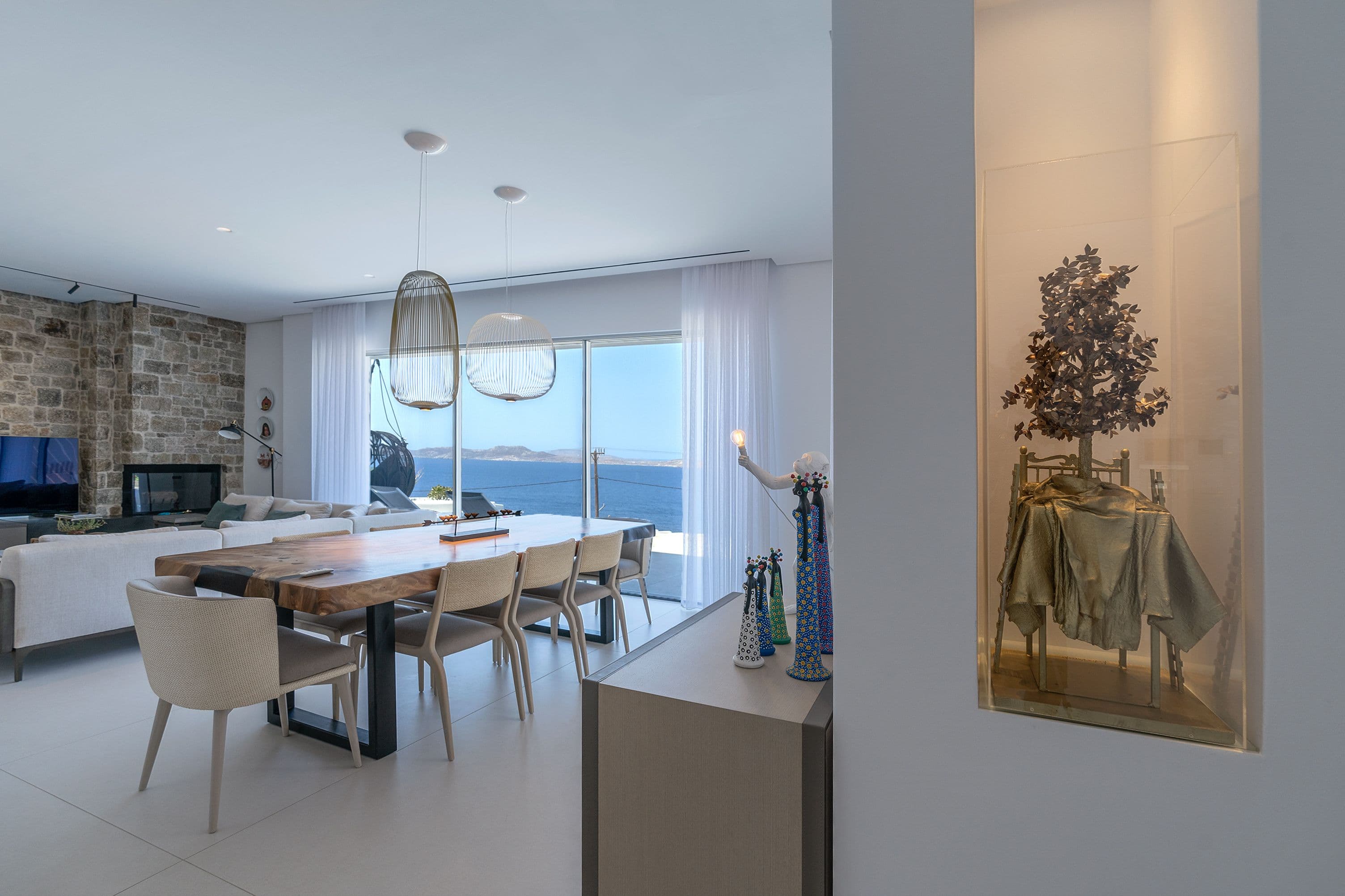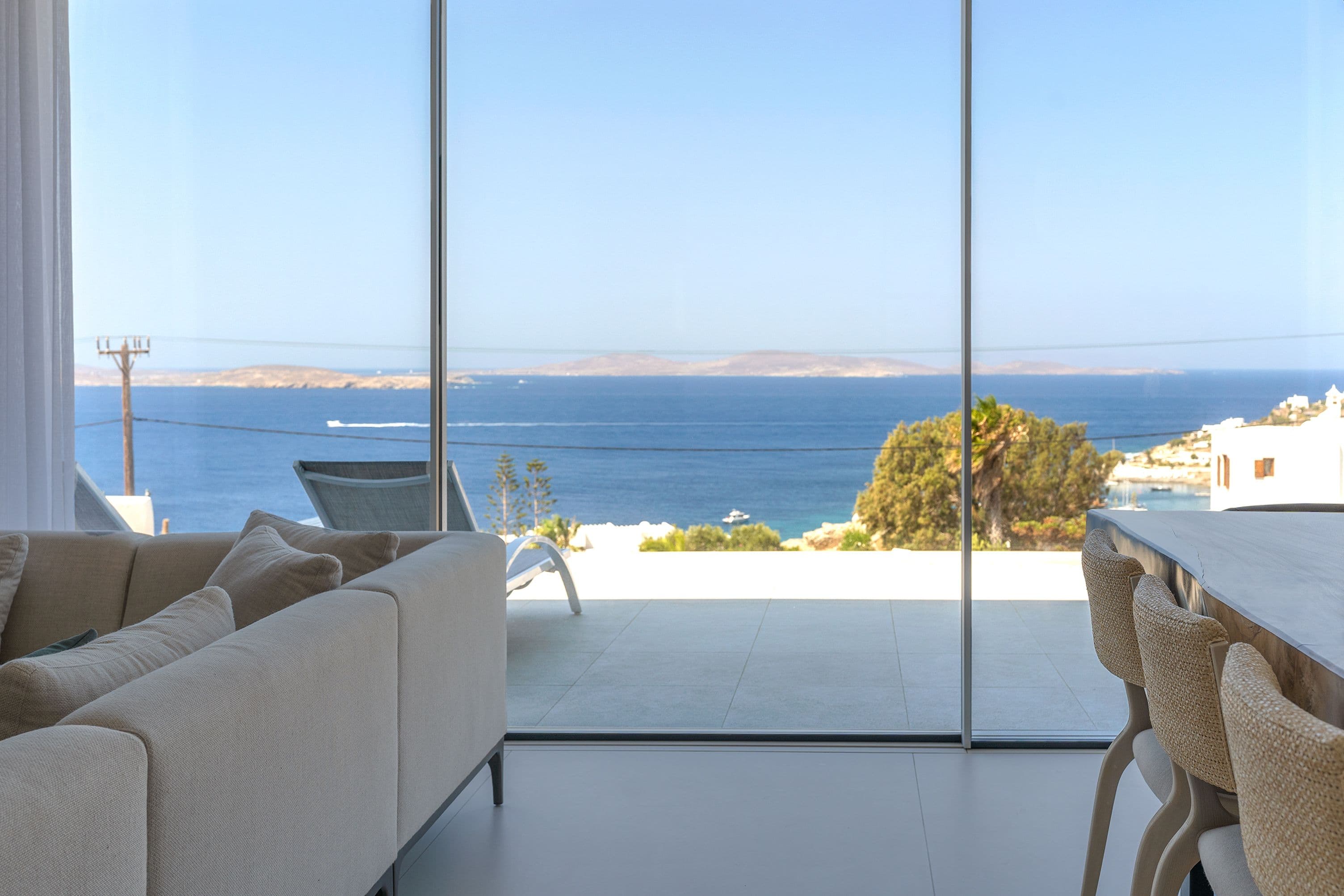 Villa Paschalia began to be built in 2017 and just got finished in 2021. The Villa is located at Agios loannis beach and has 5 suites, full kitchen, bathroom, laundry room, gym lounge, office, swimming pool, sunbeds, and of course a spectacular view and sunset over the island of Delos considered The Sacred Island for the Greeks. This luxury brand-new villa was built to make their guests feel like living in their private paradise. There are incredible 360 sqm. (3.875saf.) in a ploat of 5.800 sqm. POOL AREA This great and refreshing swimming pool is one of jewels of the Villa and makes part of the beautiful view to the sea and the Delos Island. With comfortable sun beds and a big swing chair the quests will feel wonderful out or inside the pool. LIVING AREAS A luxury designed living room with a 65' TV and comfortable couch for 8 people and a dining room with table for 12 people with chairs specifically designed for Villa P! All that while enjoy a beautiful view of the Aegan Sea. SUITES 5 comfortable suites thought out in the last details with a beautiful view of the sea, 4 with double beds and 1 (kids room) with 2 single beds. To sleep or enjoy a great movie those suites matches a 5 star hotel room. There is also one indipendent studio in the outside area of the main house. FEATURES Amenities that goes beyond of what Mykonos visitors are used to find. Villa P offers exclusive and modern features that goes from security to comfort and details like central AC, heated floors or the unique big windows design with electronic shades in the living room.