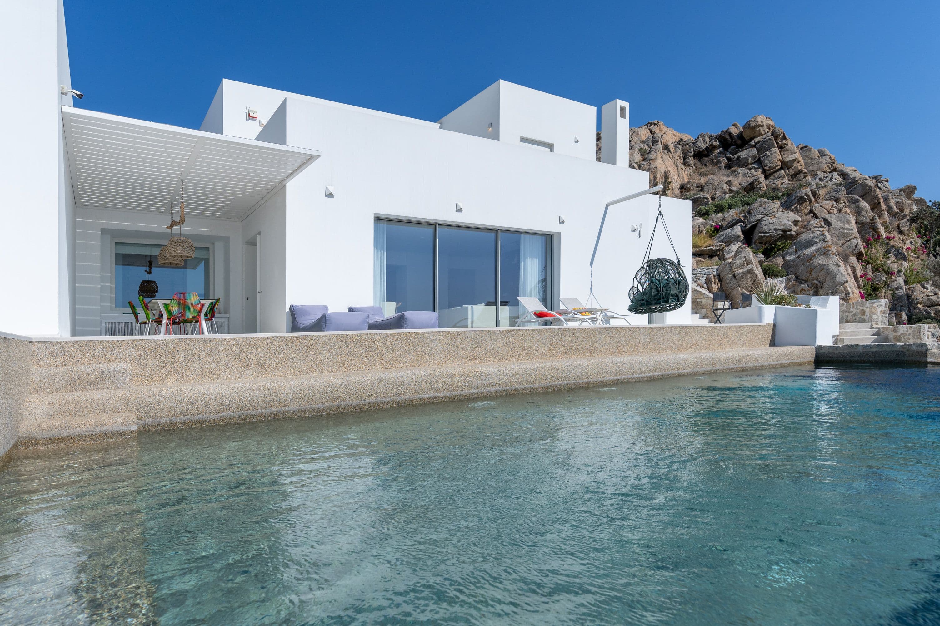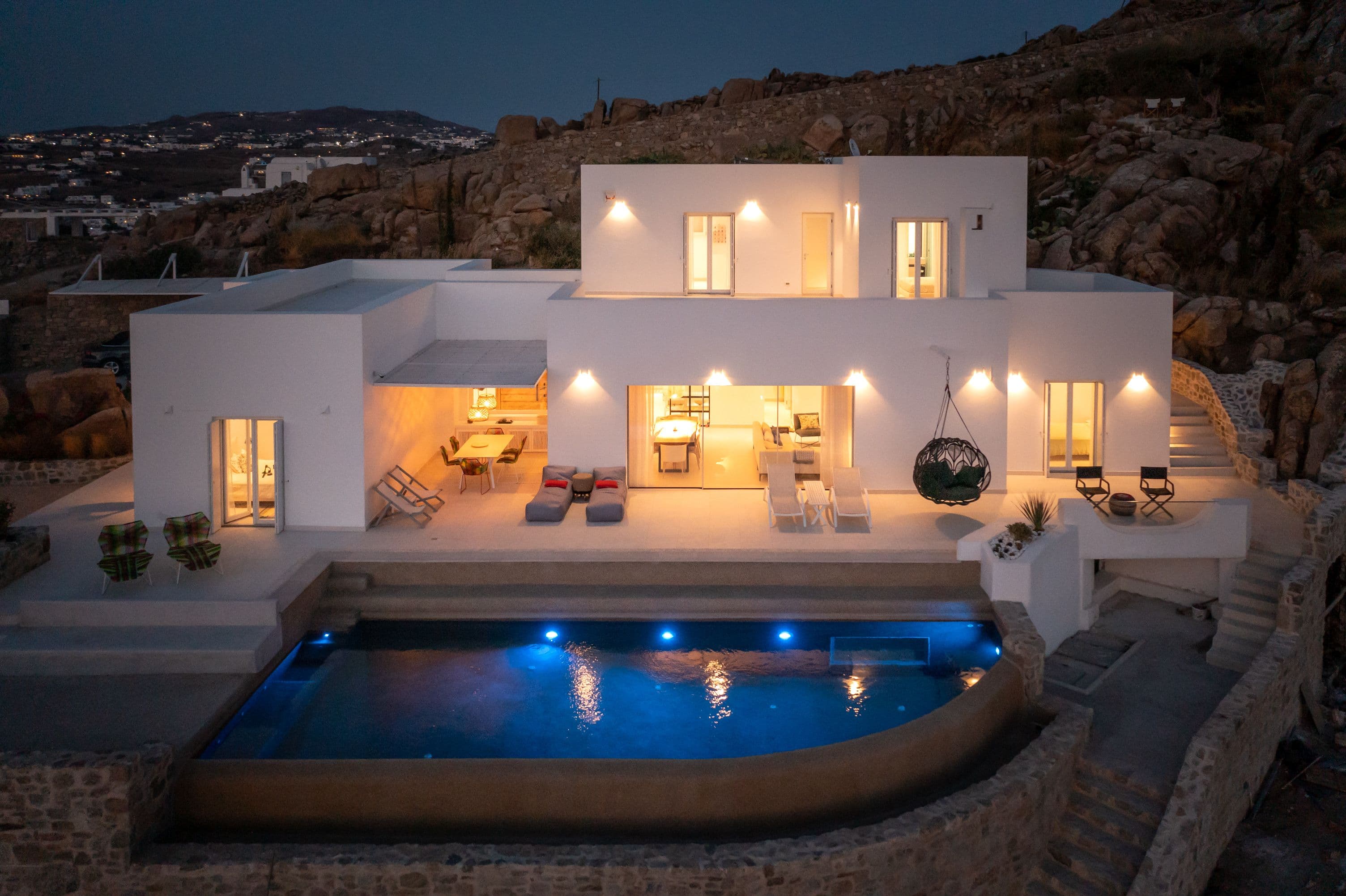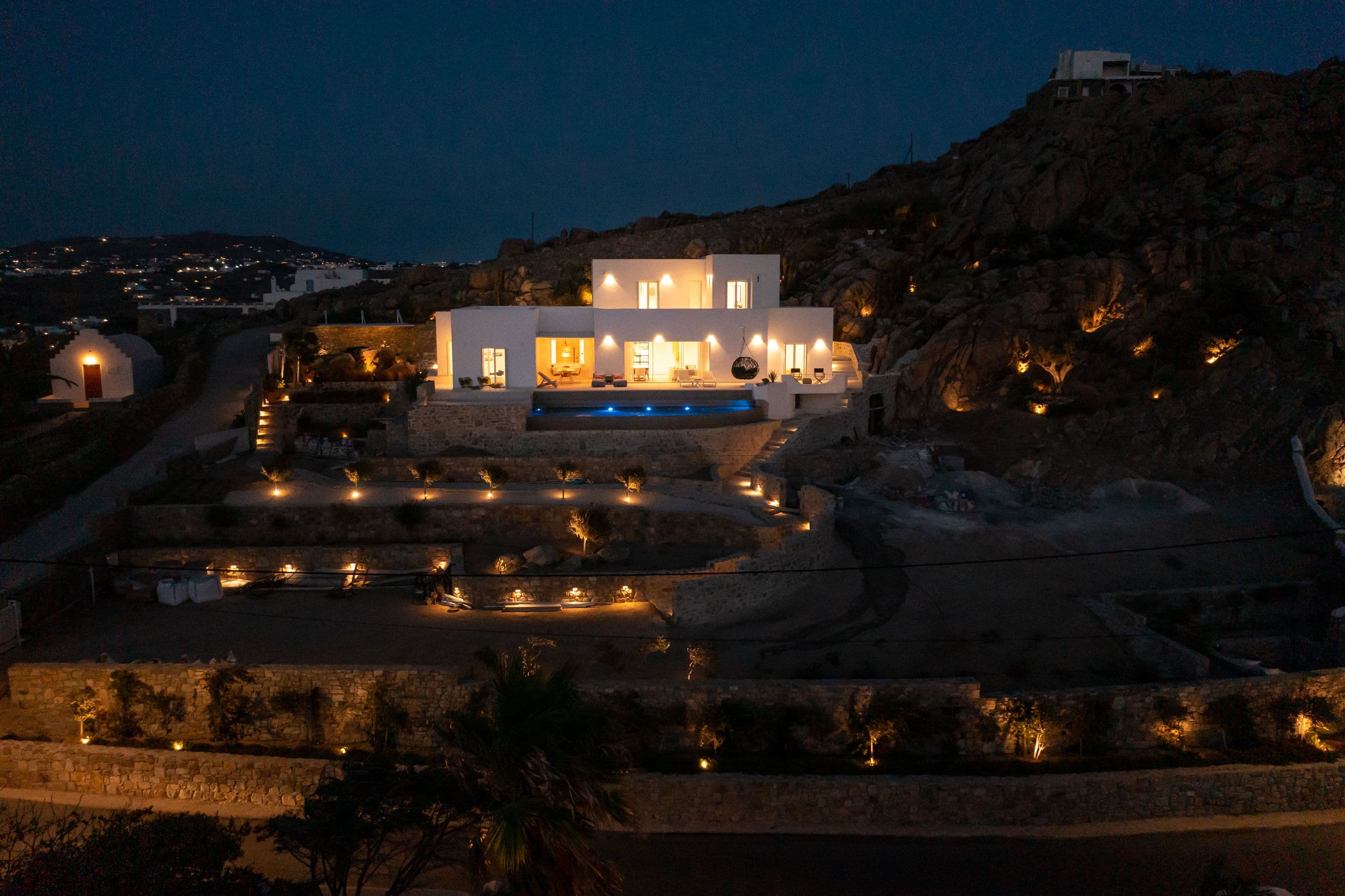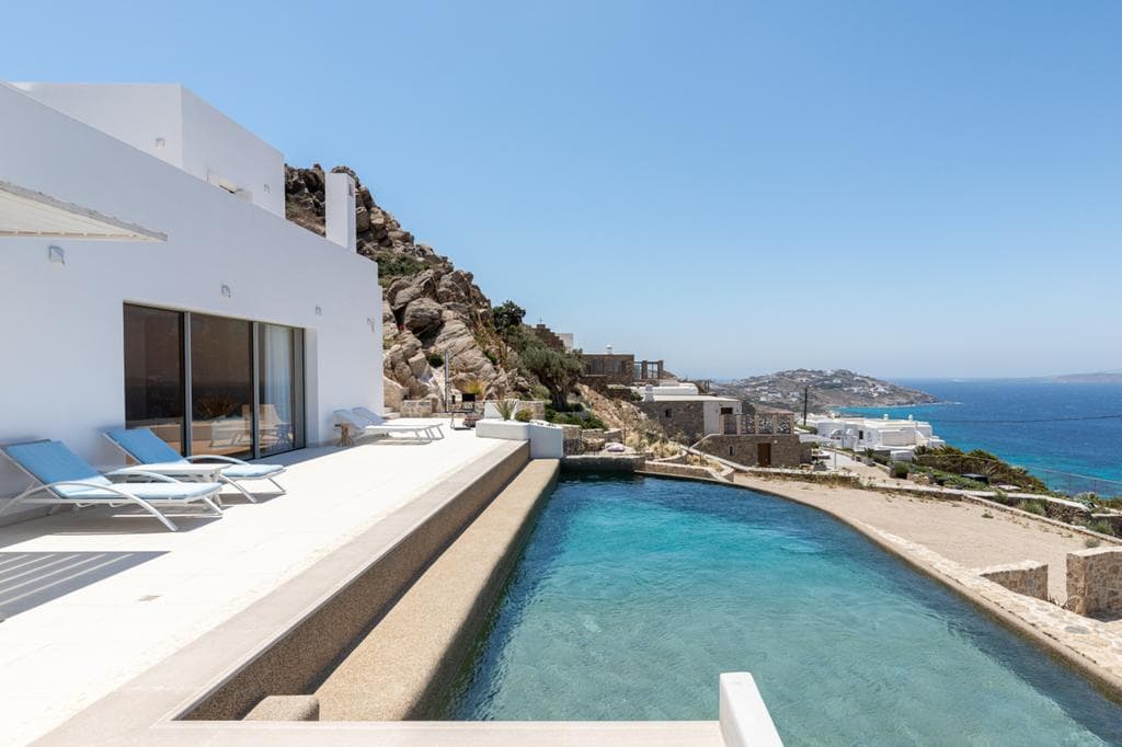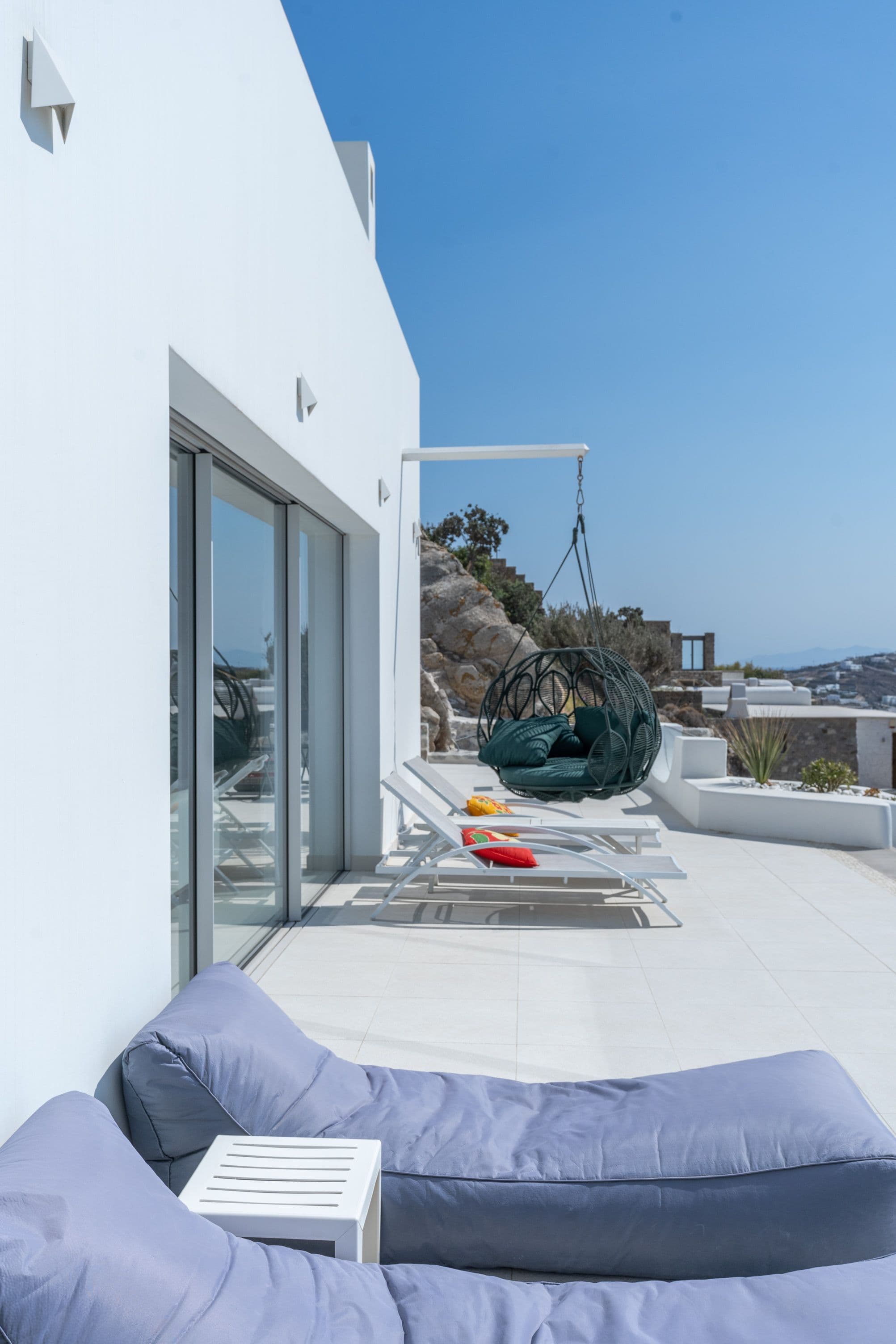The Villa is located at Agios loannis beach and has 5 suites, full kitchen, bathroom, laundry room, gym lounge, office, swimming pool, sunbeds, and of course a spectacular view and sunset over the island of Delos considered The Sacred Island for the Greeks. This luxury brand-new villa was built to make their guests feel like living in their private paradise. There are incredible 360 sqm. (3.875saf.) in a ploat of 5.800 sqm.